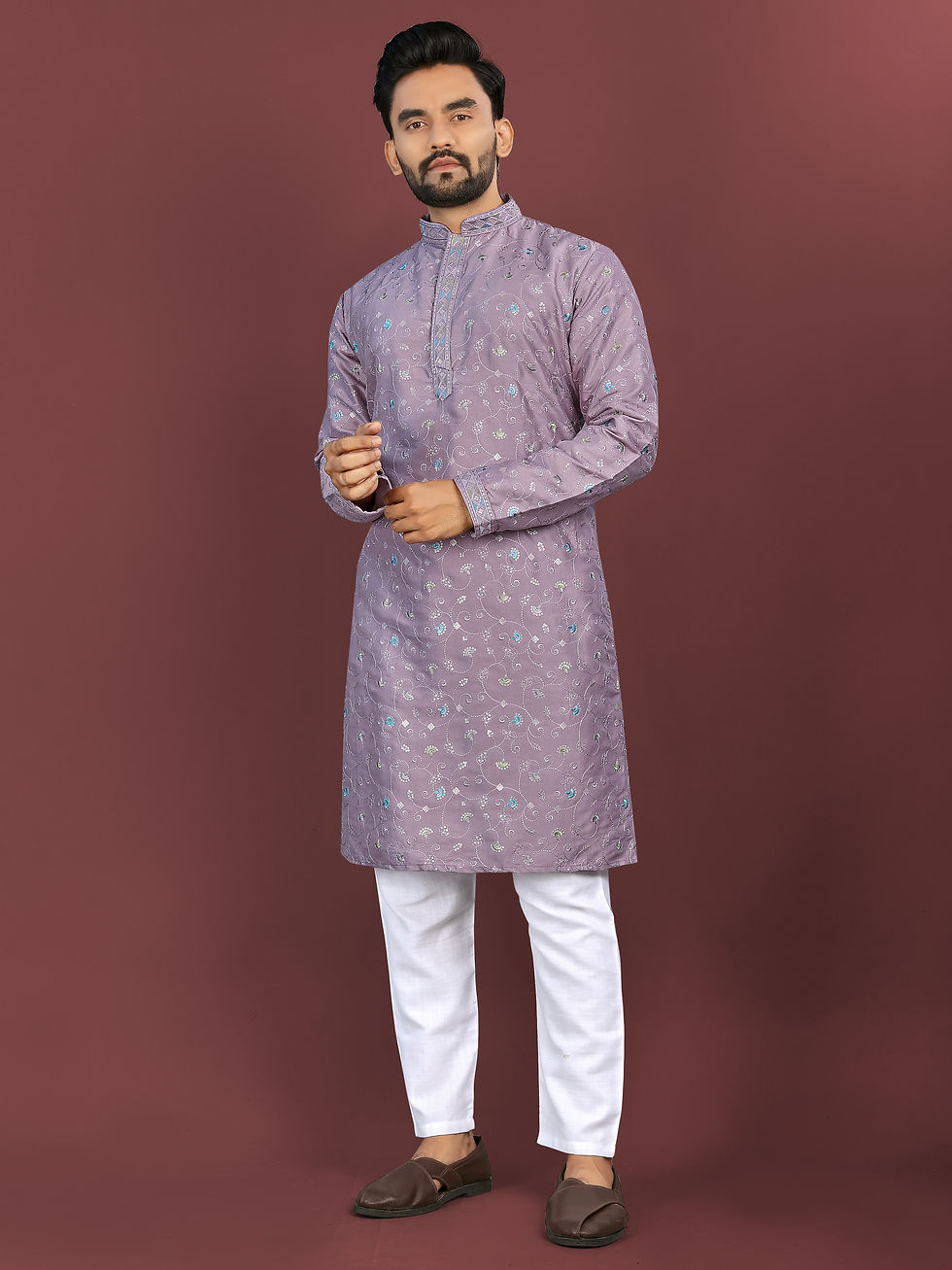 Lavender Flower Embroidery Work Men's Kurta With Pajama